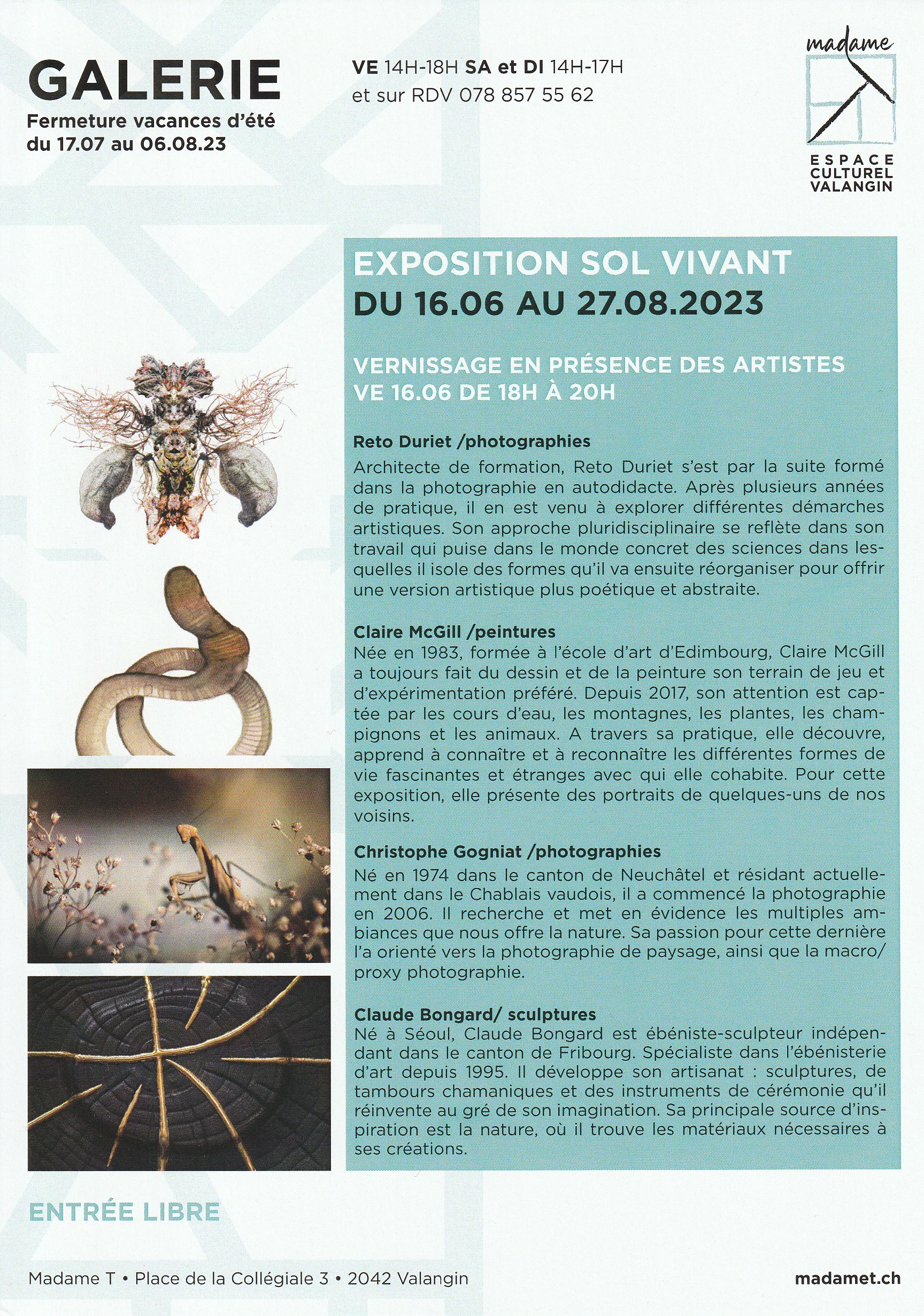J’ai le plaisir d’exposer une quinzaine d’images à la Galerie de Madame T à Valangin (Suisse – NE) du 16 juin au 27 août sur le thème du Sol Vivant. J’aurai la joie de partager ce lieu pour cette exposition avec trois autres artistes (photographe, peintre et sculpteur). Le vernissage aura